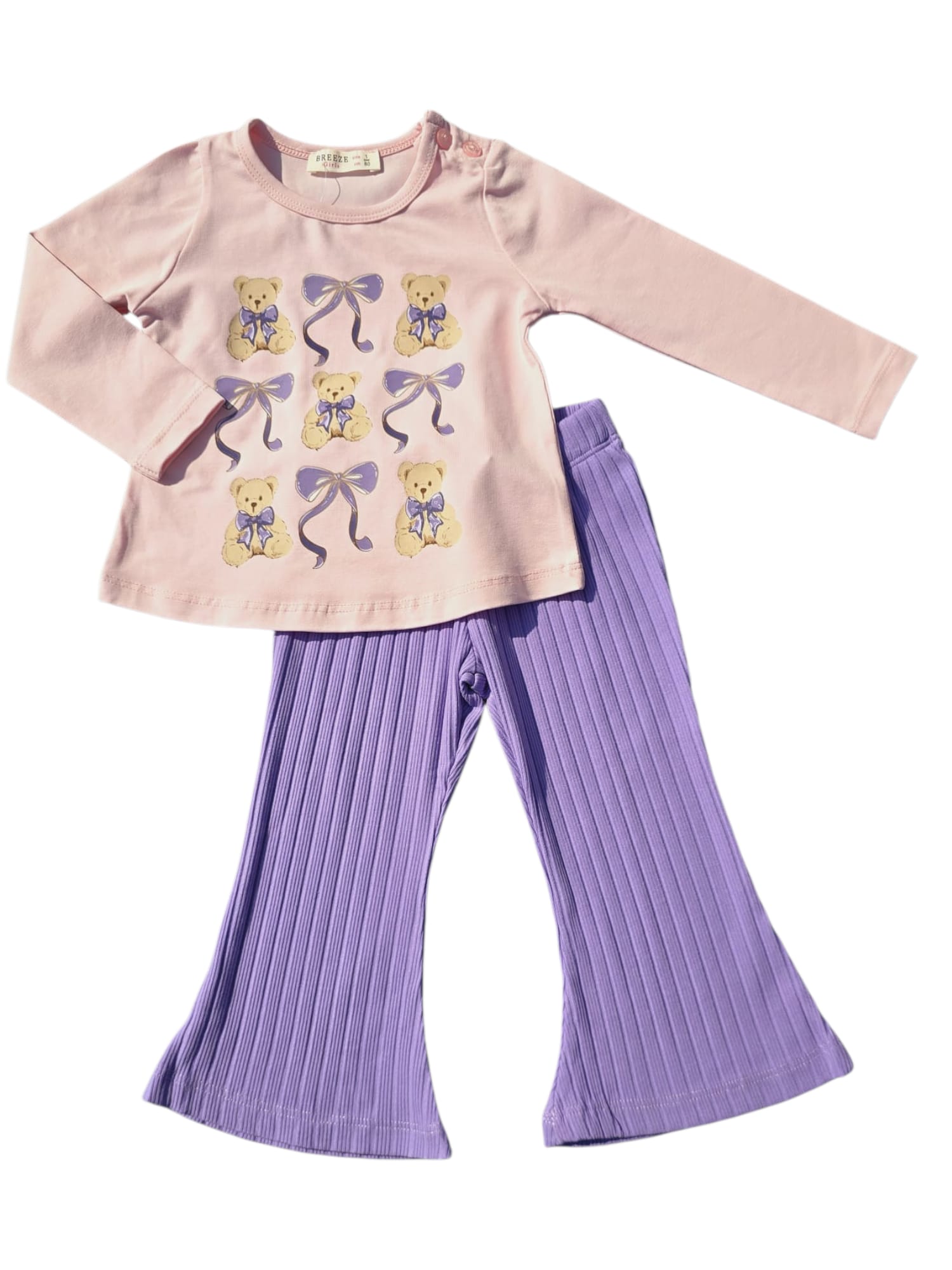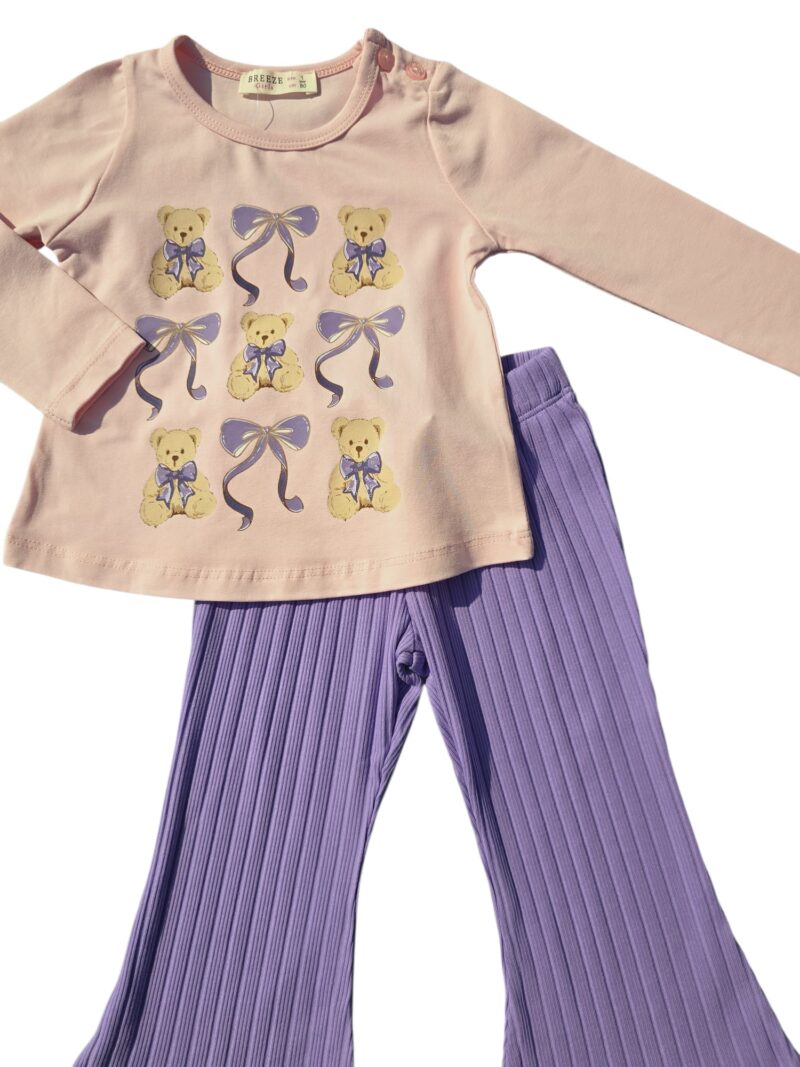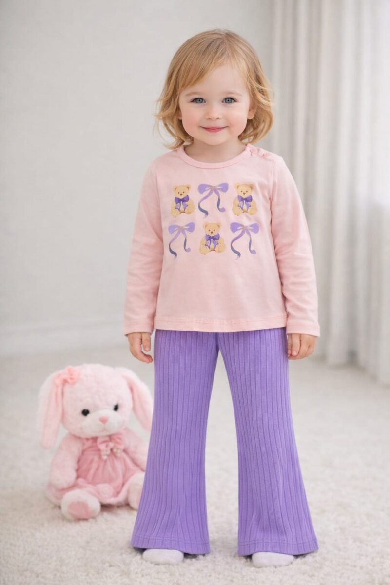 Un set adorabil pentru micile iubitoare de culoare și joacă! 💜 Bluzița roz cu imprimeu drăgălaș și pantalonii mov evazați creează o ținută veselă și confortabilă, perfectă pentru plimbări, joacă sau momente speciale. Moale și ușor de purtat, acest set aduce stil și bună dispoziție în fiecare zi.