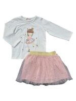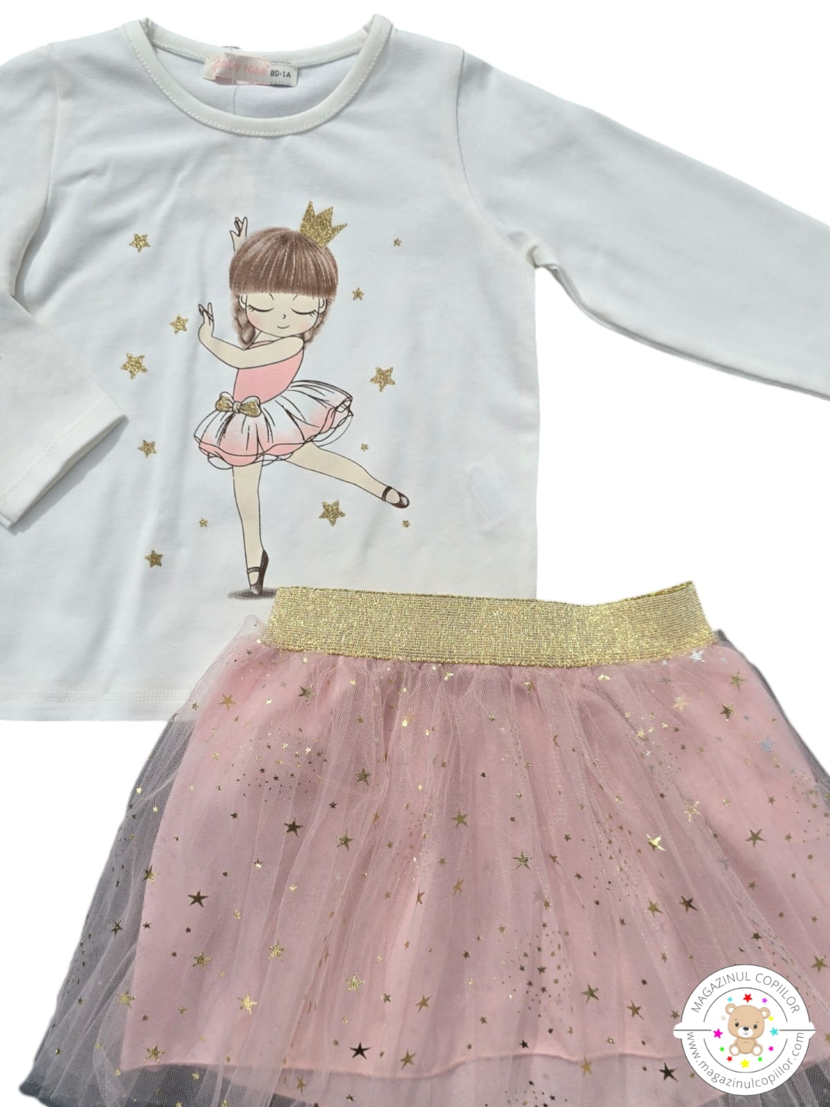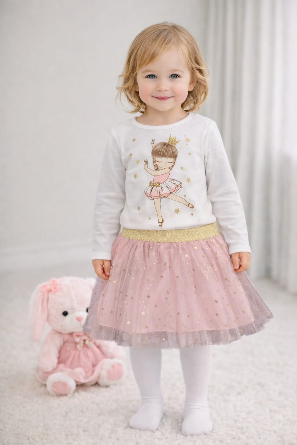 Bluzița cu imprimeu adorabil și fustița din tulle cu accente aurii creează o ținută magică și plină de farmec. Confortabil și elegant, perfect pentru momente speciale sau joacă plină de imaginație.