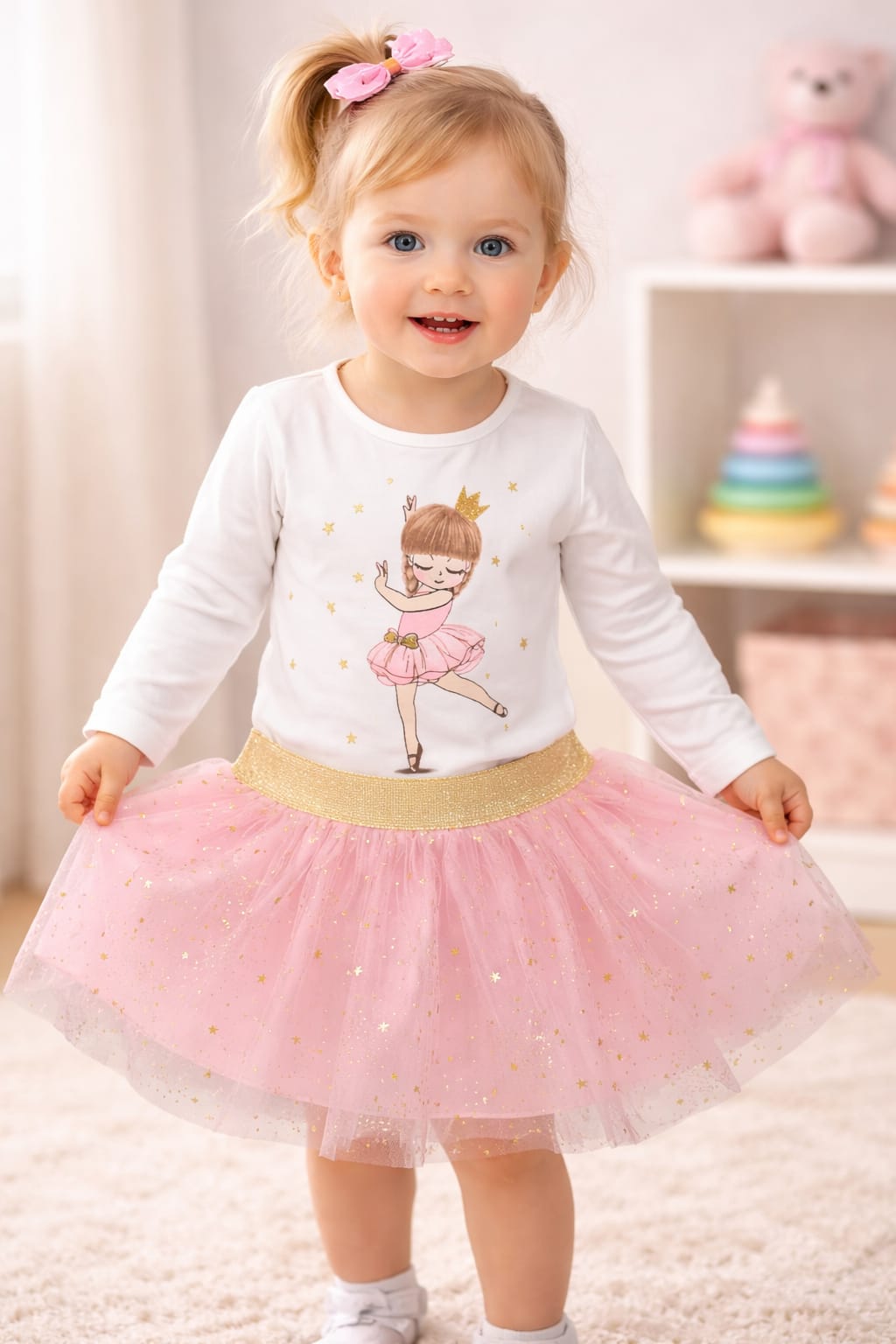 Bluzița cu imprimeu adorabil și fustița din tulle cu accente aurii creează o ținută magică și plină de farmec. Confortabil și elegant, perfect pentru momente speciale sau joacă plină de imaginație.