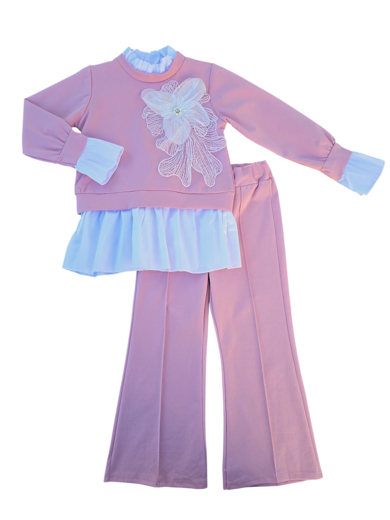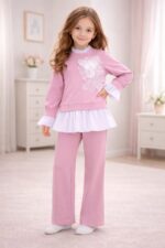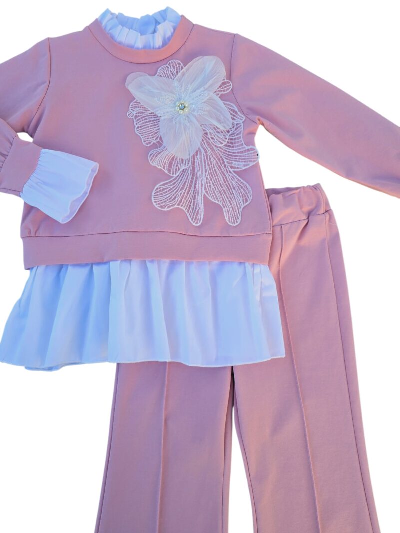 Set elegant pentru fetițe, compus din bluză roz cu aplicație florală delicată și volănașe fine, alături de pantaloni drepți, comozi, cu croială modernă. Realizat din materiale moi și plăcute la purtare, acest outfit este ideal atât pentru ținute de zi, cât și pentru ocazii speciale, oferind un look rafinat și jucăuș în același timp. Material: 95% bumbac, 5% elastan Fabricat în Italia