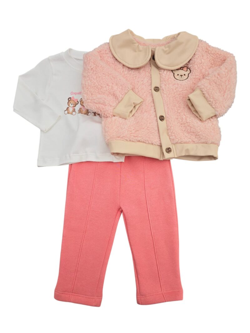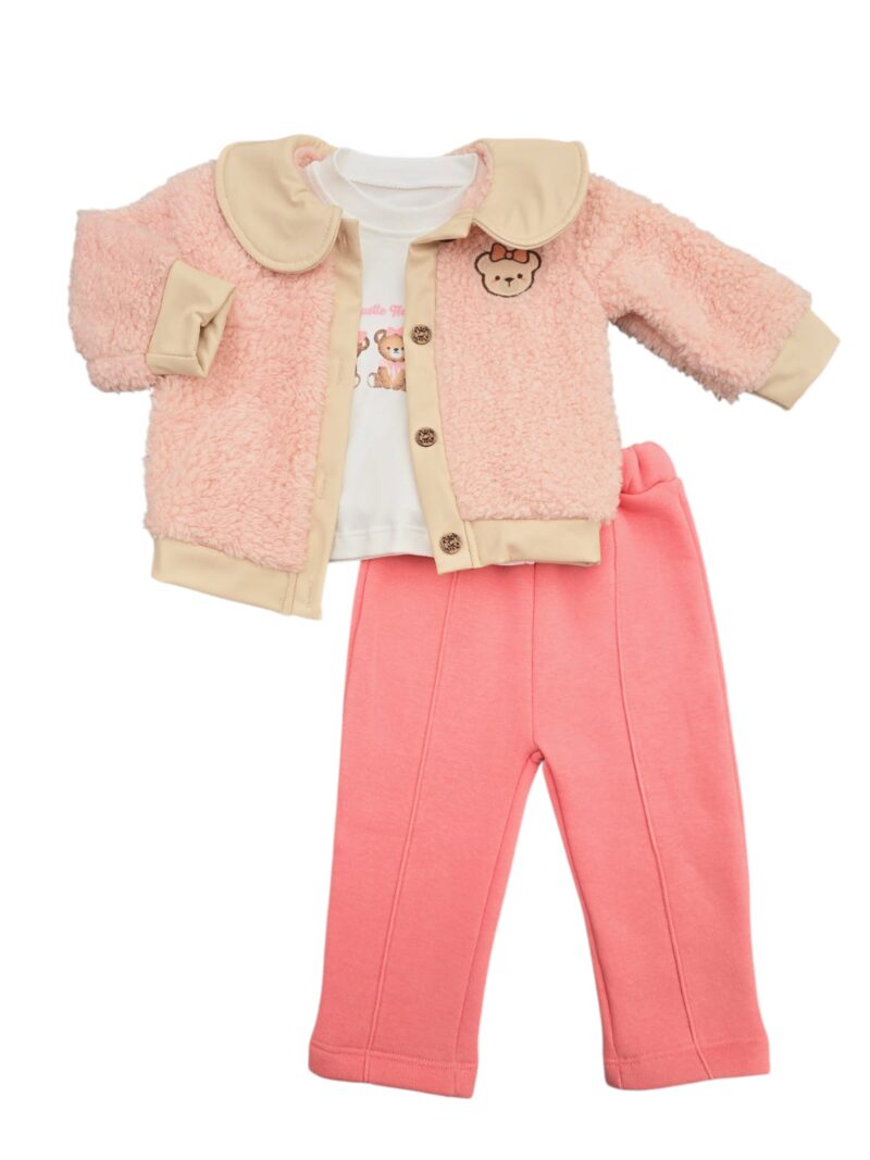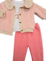 -20%Costum vătuit 3 piese: compus din bluză cu mânecă lungă, pantaloni și jachetă călduroasă. Bluza este realizată din bumbac, iar pantalonii sunt comozi, ușor elastici și căptușiți pe interior pentru un plus de confort termic. Jacheta este confecționată din material pufos tip cocolino, foarte plăcut la atingere, prevăzută cu nasturi și guler decorativ, fiind ideală pentru zilele răcoroase. Ținuta este practică, călduroasă și perfectă pentru purtarea zilnică în sezonul rece.