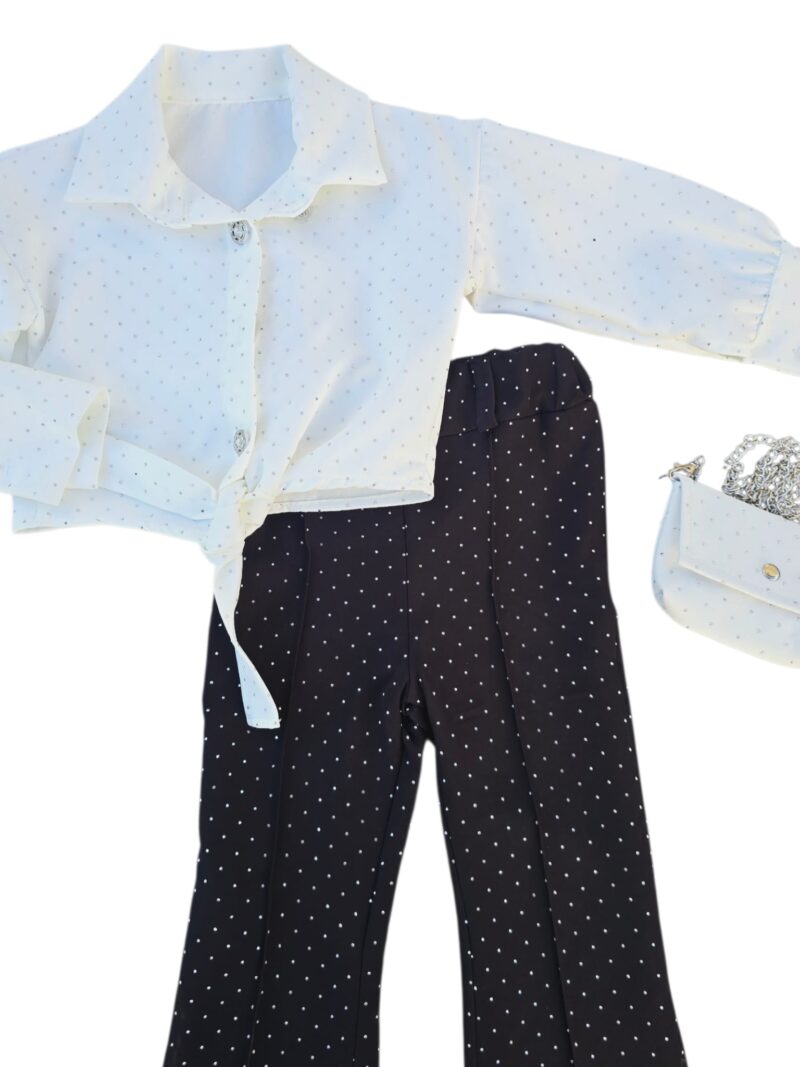 Set modern pentru fete, format din cămașă albă și pantaloni negri cu croială evazată, decorați cu pietricele fine (bulinuțele din imagine). Designul oferă un look chic și feminin, perfect pentru ocazii speciale sau ținute deosebite.