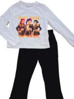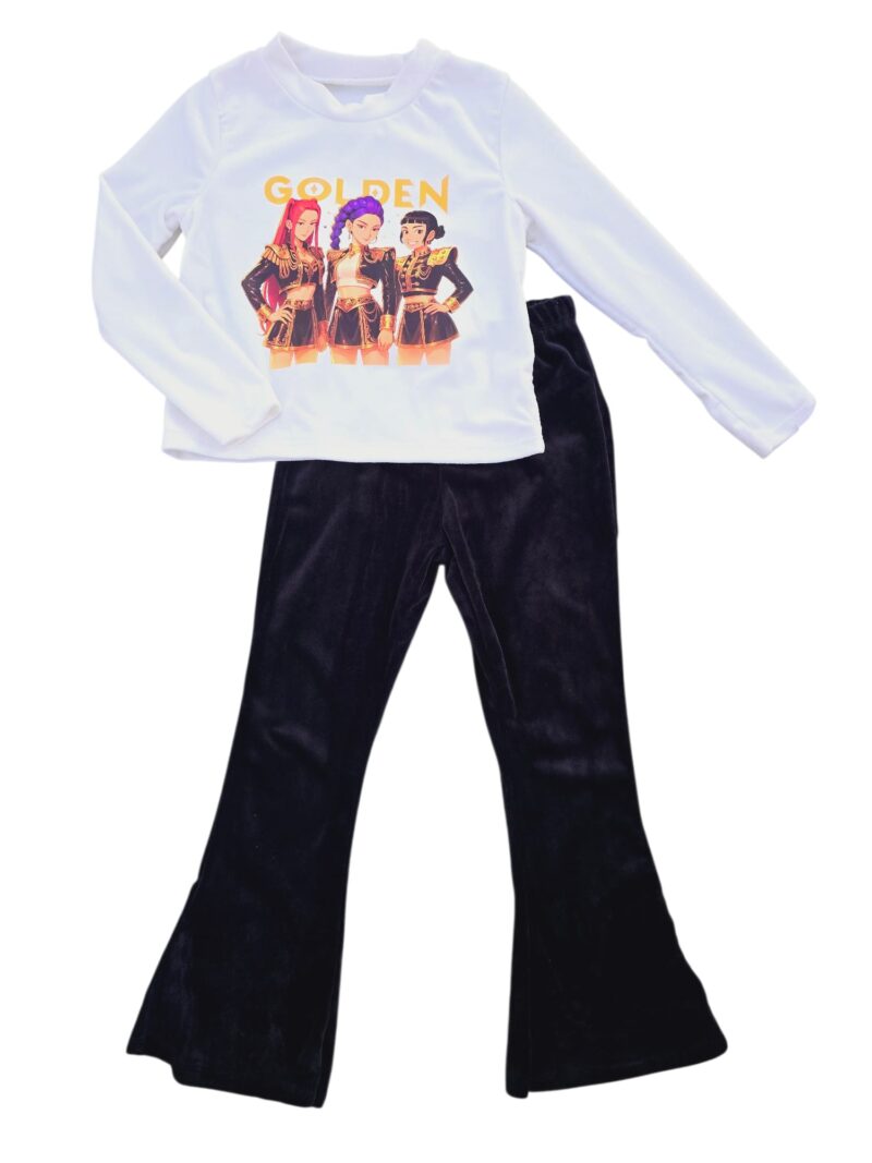 Costum fete din catifea, compus din bluză cu mânecă lungă și pantaloni evazați. Bluza este decorată cu imprimeu modern „GOLDEN”, inspirat din stil K-pop. Material moale și plăcut la atingere, ideal pentru ținute confortabile și trendy. Material: catifea Fabricat în Italia