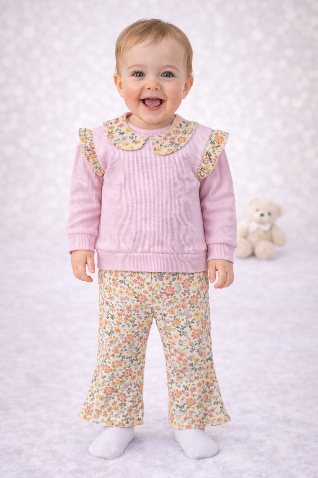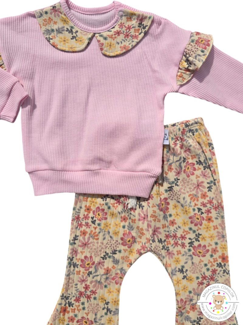 Set delicat și confortabil, format din bluziță cu detalii florale și pantaloni evazați cu imprimeu vesel. Material moale, ideal pentru pielea sensibilă, perfect pentru ținute de zi cu zi. 🌸