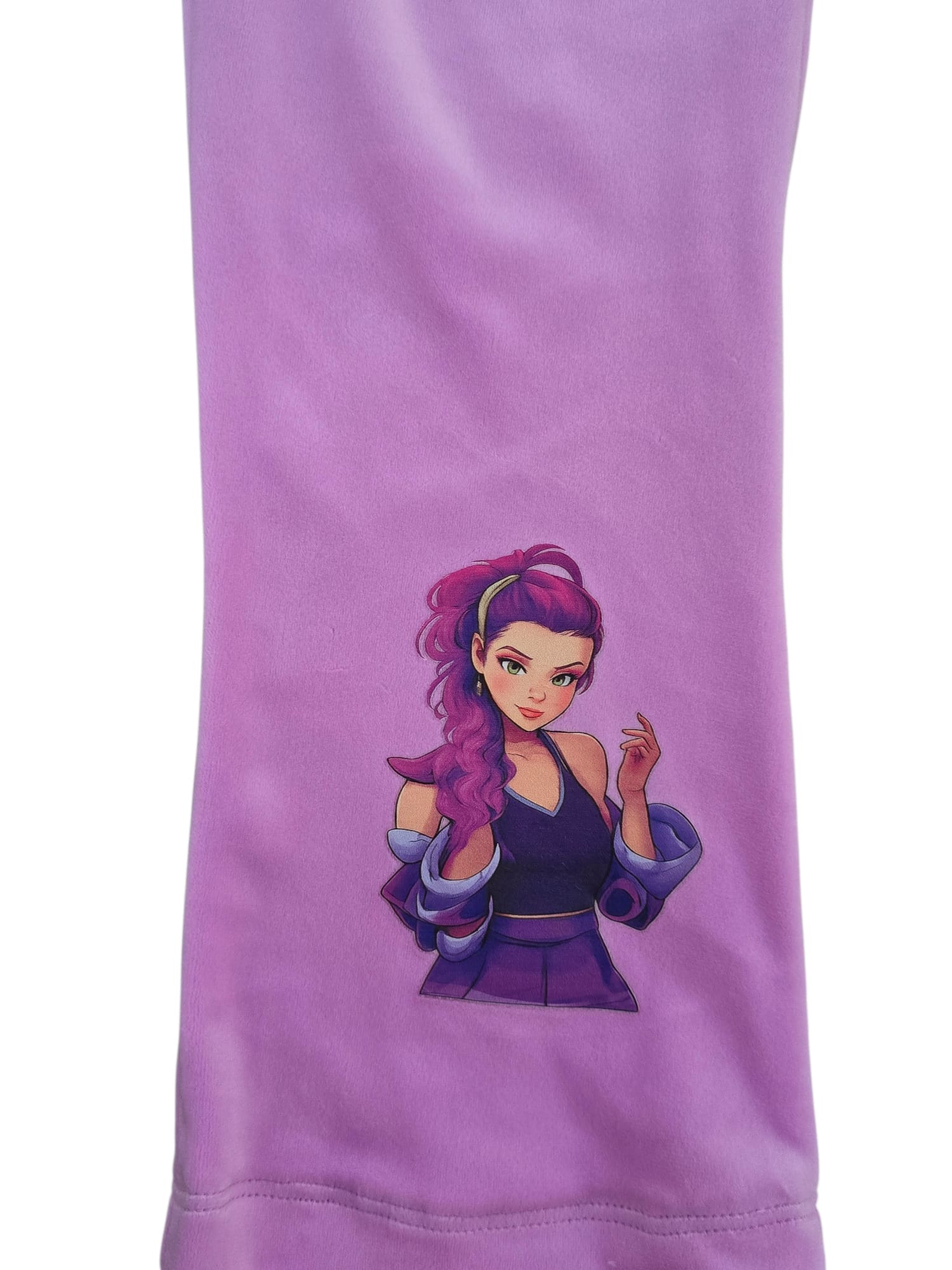 Pantaloni pentru fete din catifea moale, culoare roz intens, cu imprimeu modern Huntrix aplicat pe picior. Comozi, plăcuți la atingere și ideali pentru ținute casual sau seturi sport, oferind un look vesel și actual. Material: catifea- 100% bumbac Fabricat în Italia