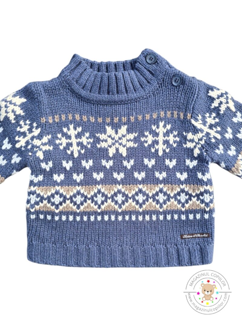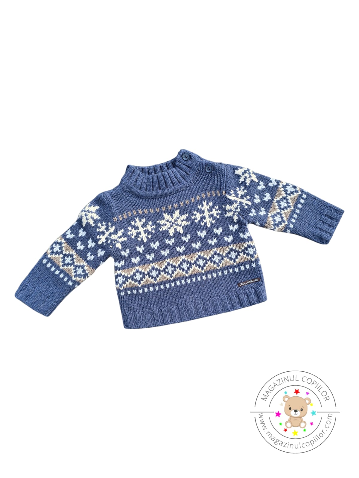 Pulover pentru băieți, realizat din material tricotat (PNA), moale și călduros. Model cu motive nordice și închidere cu nasturi pe umăr, pentru îmbrăcare ușoară. Are guler rotund, manșete și tiv elastic. Ideal pentru sezonul toamnă–iarnă, confortabil și practic pentru purtarea zilnică 👦❄️