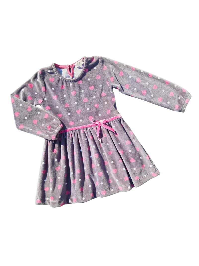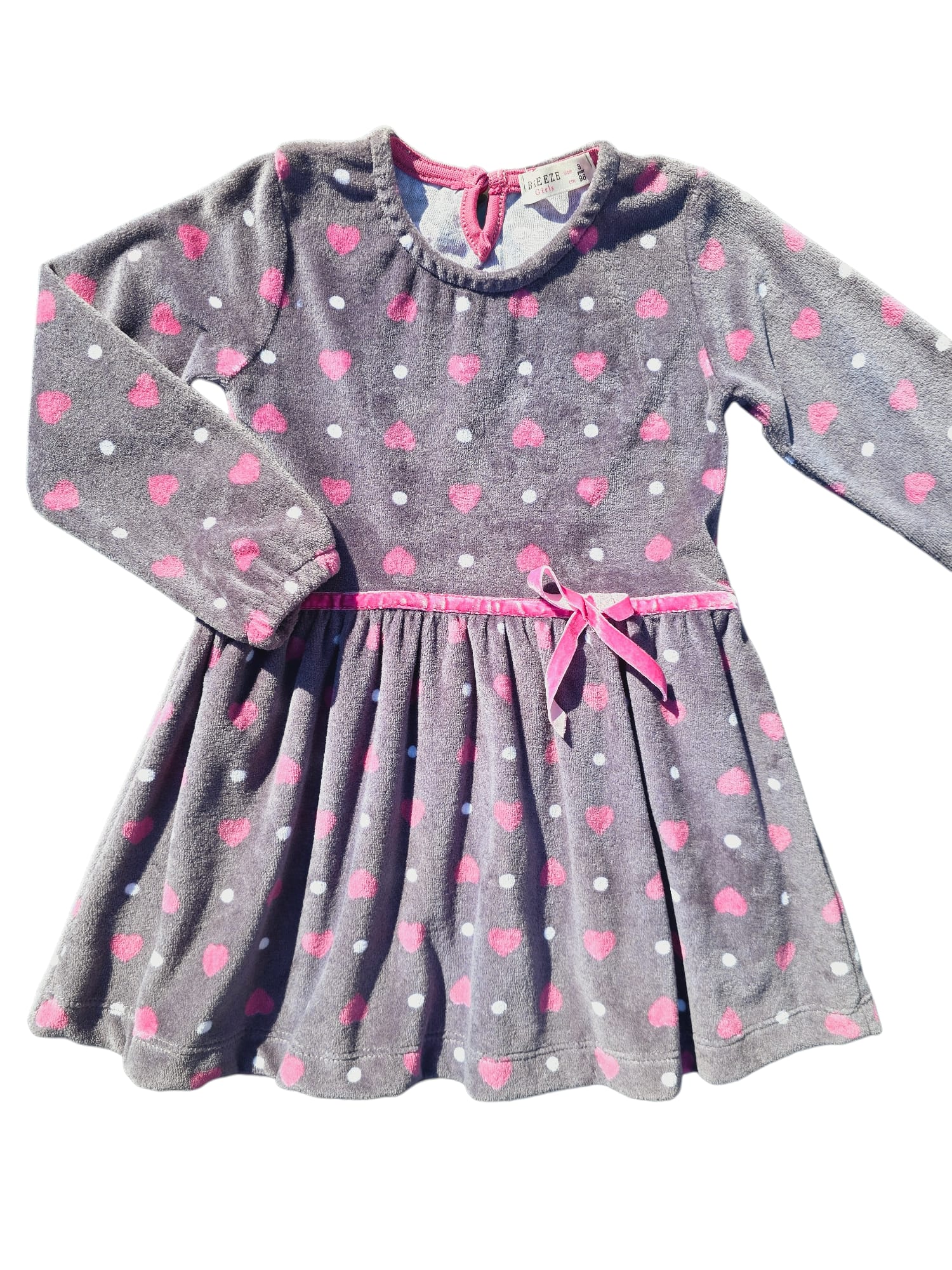 Rochiță pentru fete, realizată din material catifea moale și plăcut la atingere. Model cu mânecă lungă, imprimeu cu inimioare și fundiță decorativă în talie, ideală pentru ținute confortabile și elegante. 💗