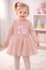 Rochiță pentru fetițe, cu design delicat și aplicații florale. Material moale și confortabil, cu fustiță din tull, ideală pentru ținute elegante și ocazii speciale. 🌸