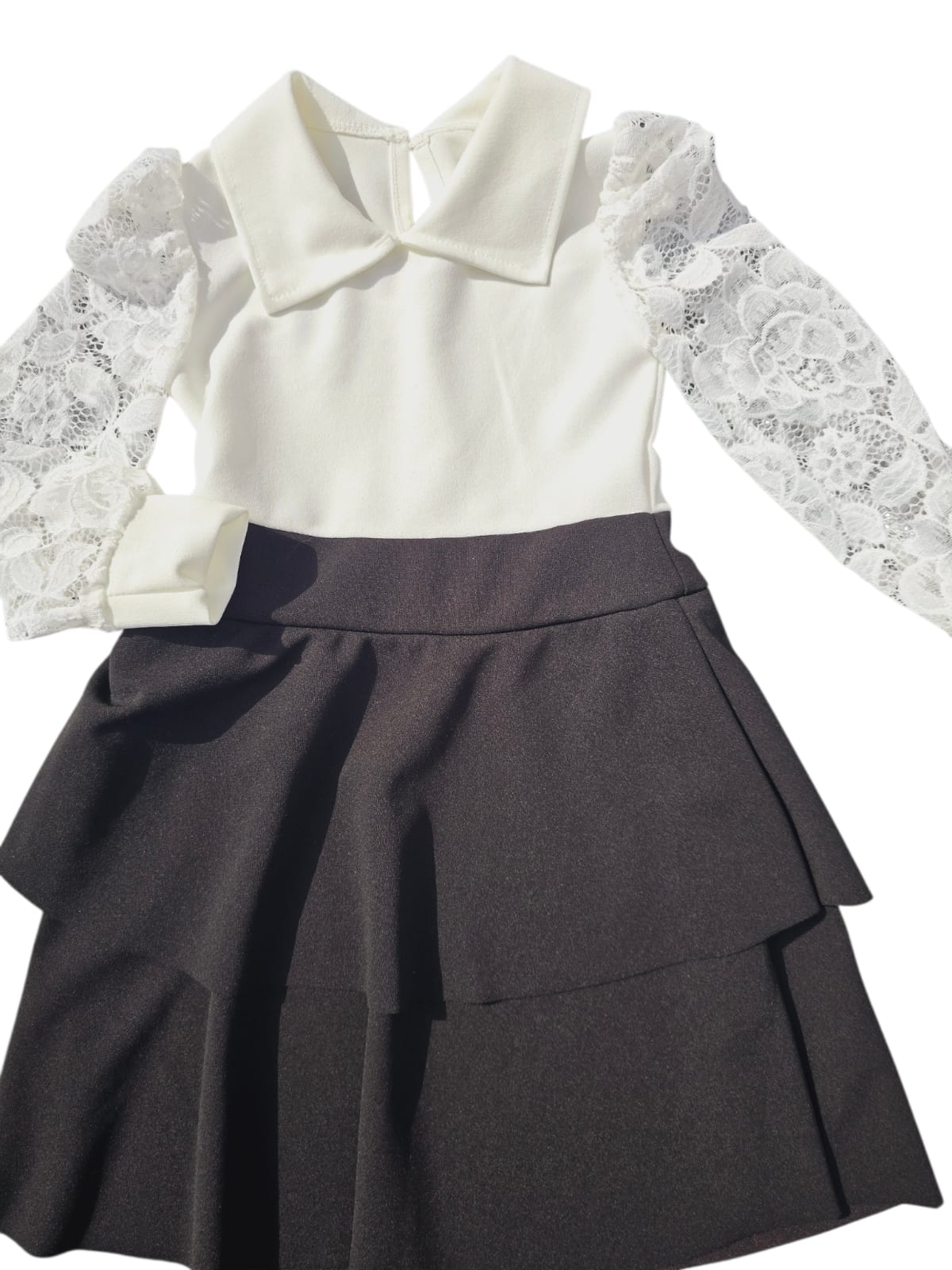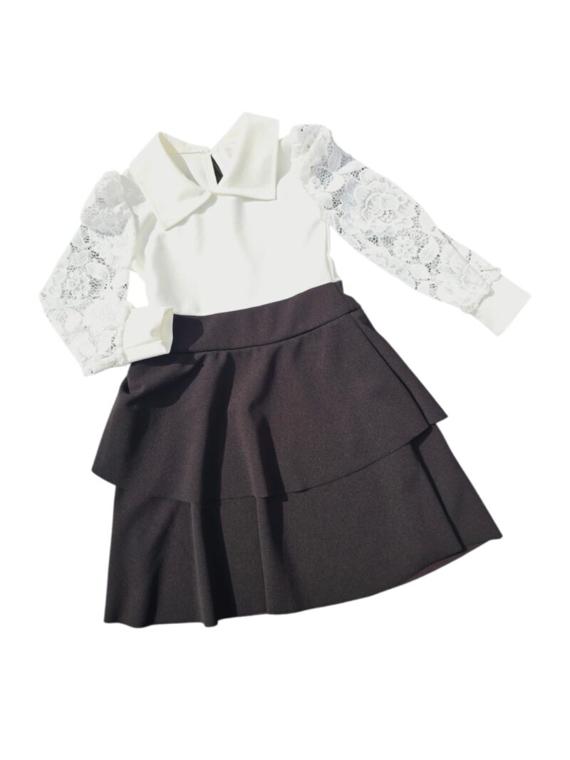 Rochiță rafinată pentru fete, cu partea superioară albă și fustiță neagră cu volane, ce oferă un look feminin și elegant. Modelul este completat de mânecuțe din dantelă fină, pentru un plus de delicatețe.