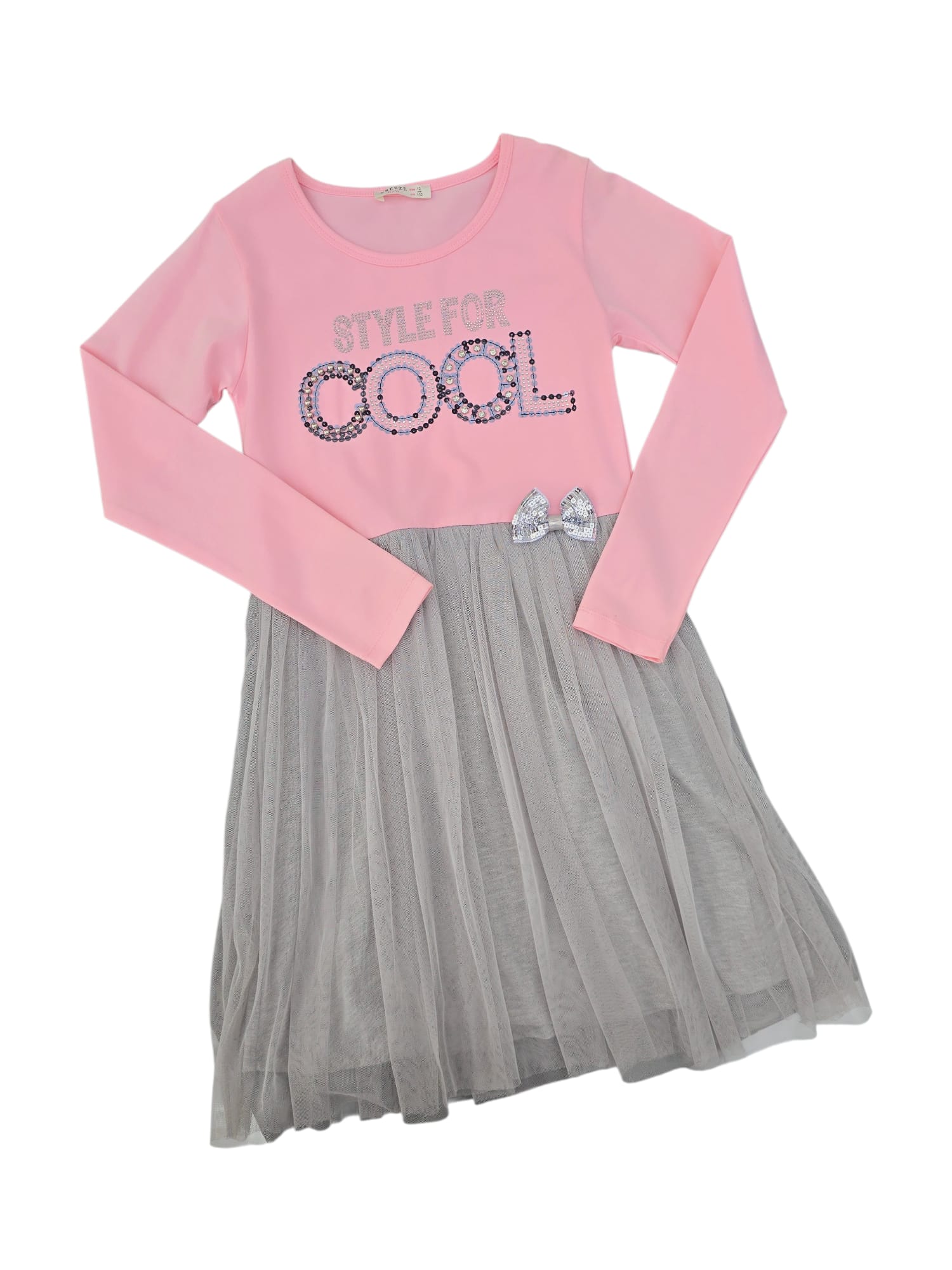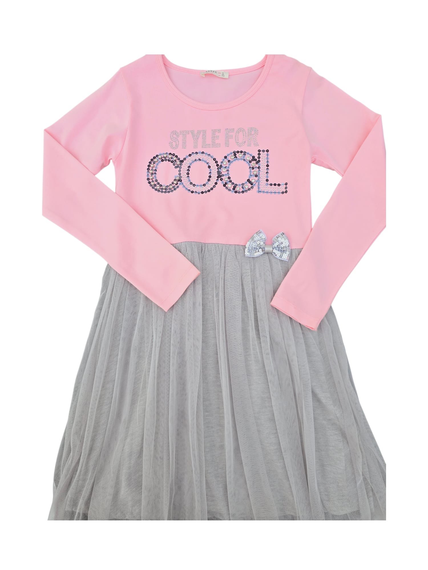 Rochiță chic, cu mâneci lungi roz și fustă vaporoasă din tulle gri. Detalii strălucitoare și fundiță delicată pentru un look cool și elegant ✨