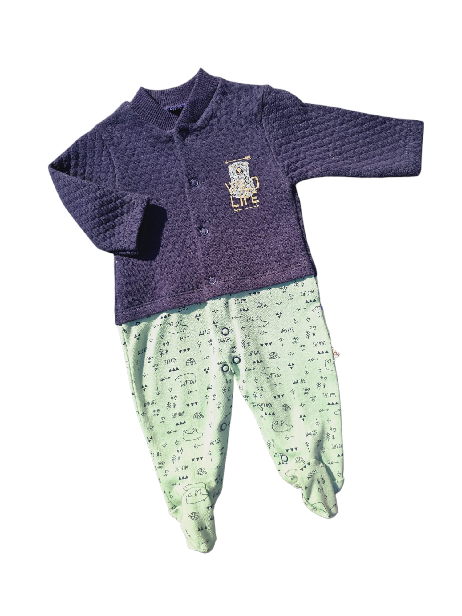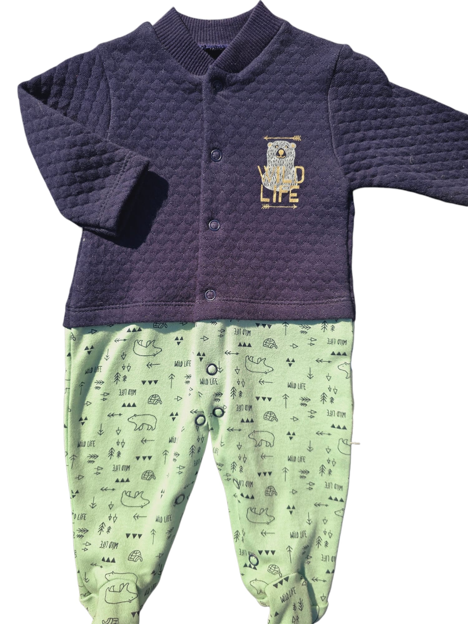Salopetă bebe tip 2 piese, cu design „Wild Life”. Model cu închidere cu capse pentru îmbrăcare și schimbare ușoară, imprimeu vesel cu animăluțe și detalii contrastante. Realizată din material moale și confortabil, ideală pentru purtare zilnică.