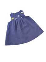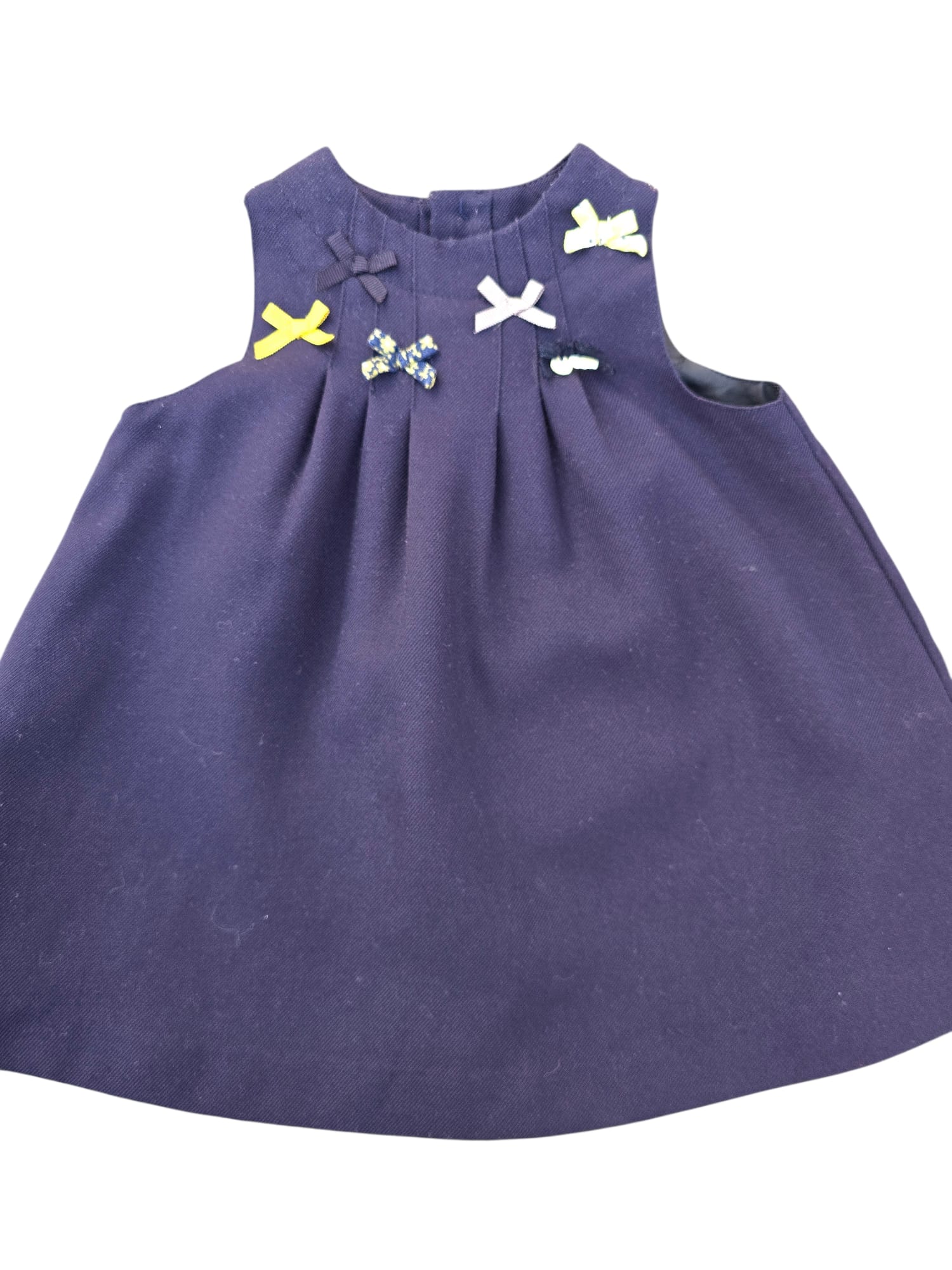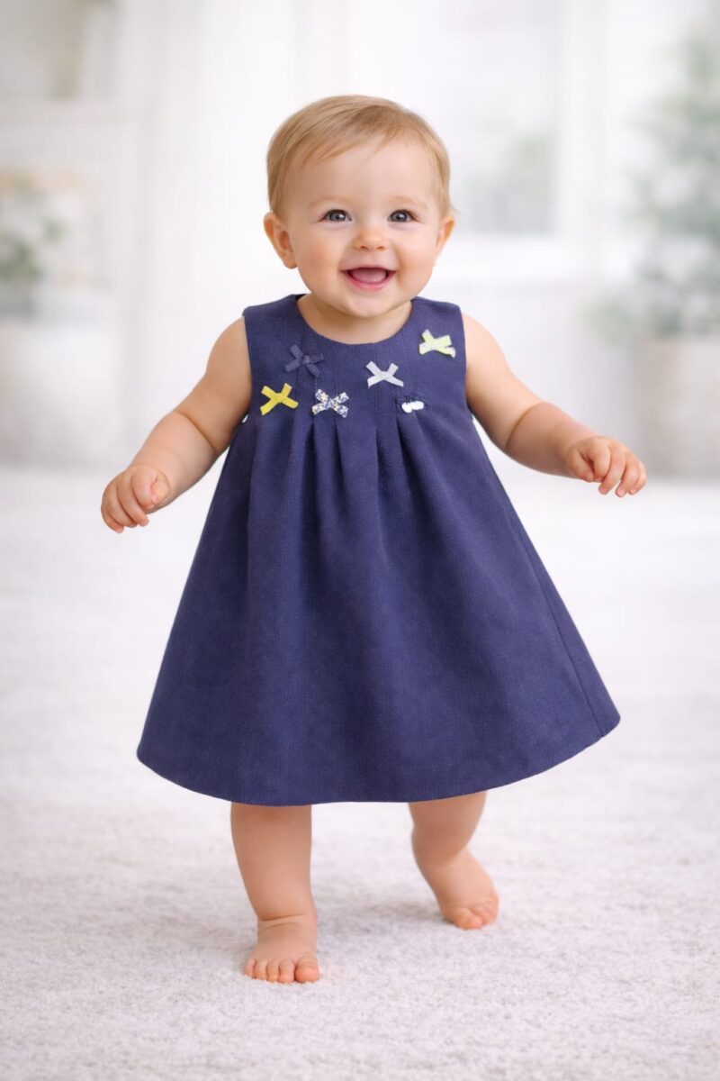 Rochie elegantă pentru fetițe 0–12 luni, realizată într-o nuanță delicată de bleumarin, decorată cu mici fundițe colorate în partea superioară. Croiala lejeră oferă confort și libertate de mișcare, fiind ideală pentru plimbări, evenimente sau ședințe foto. Un outfit adorabil și practic pentru micuța ta. 👶💙
