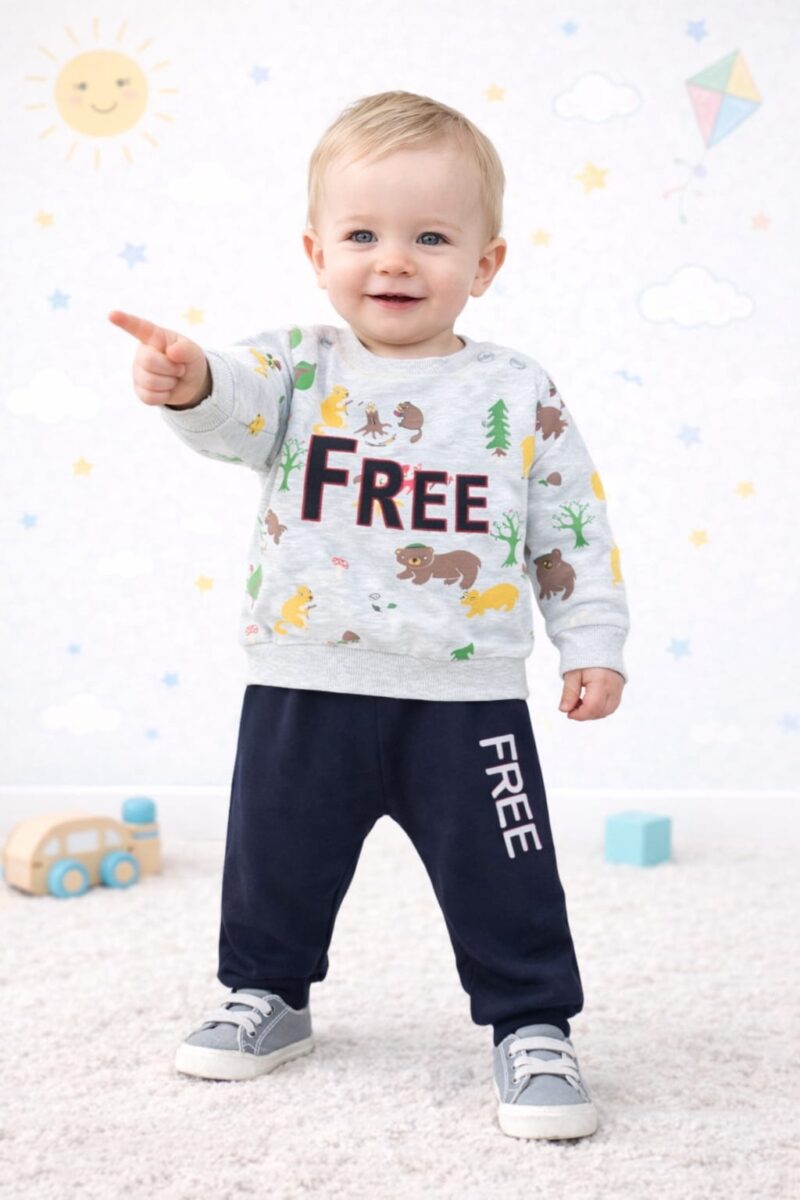 Un trening modern pentru băieței, format din bluză gri cu imprimeu vesel inspirat din natură și mesaj „FREE”, alături de pantaloni bleumarin comozi. Realizat din material moale din bumbac, oferă confort și libertate de mișcare, fiind ideal pentru joacă și activități zilnice.
