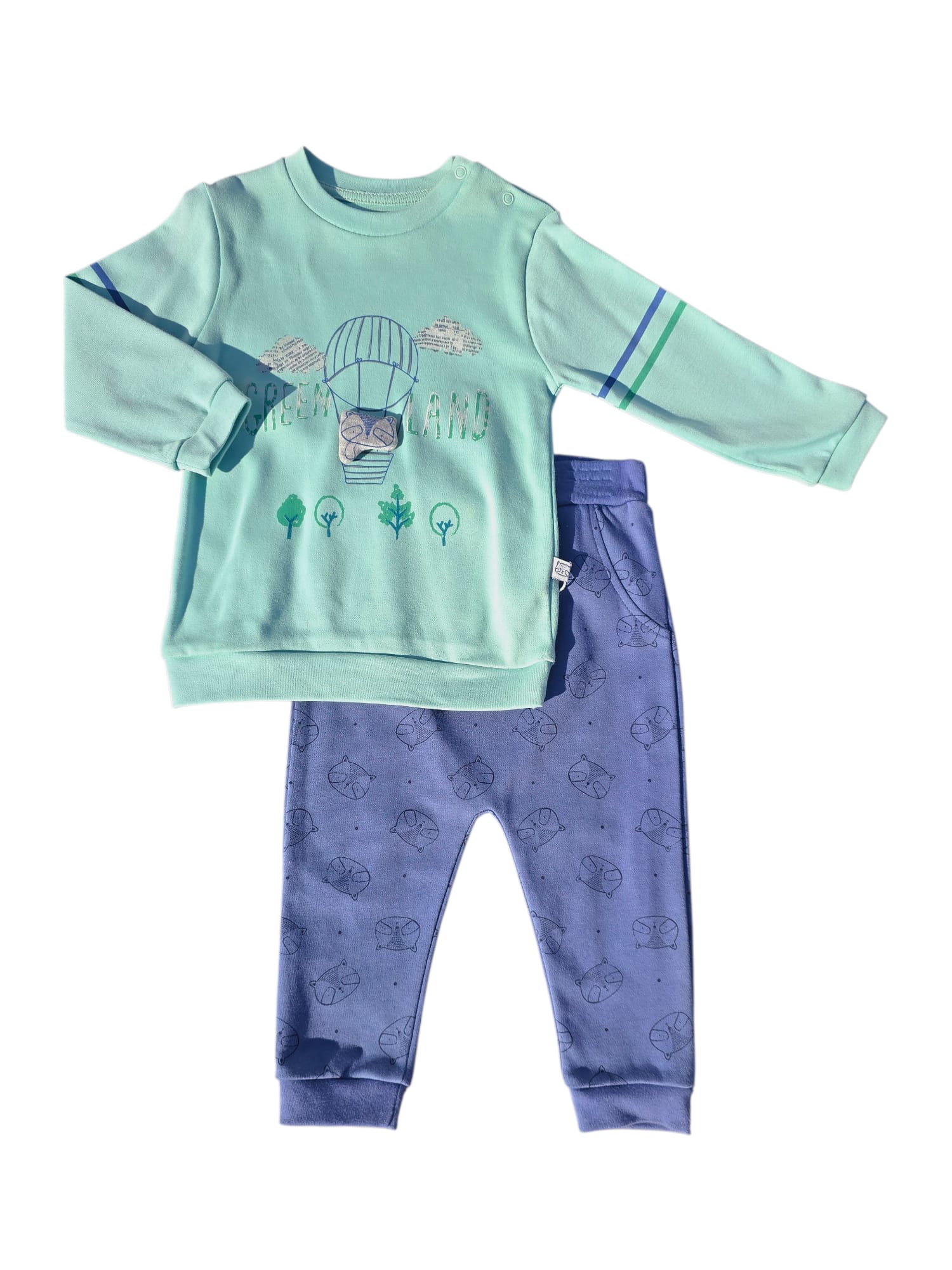 Bluza are un imprimeu simpatic cu balon cu aer cald și detalii colorate, iar pantalonii comozi sunt decorați cu imprimeuri drăgălașe asortate. Material moale și plăcut la atingere, ideal pentru mișcare, plimbări sau momentele de relaxare. Un set vesel, care aduce zâmbete și libertate de joacă! 💚👦