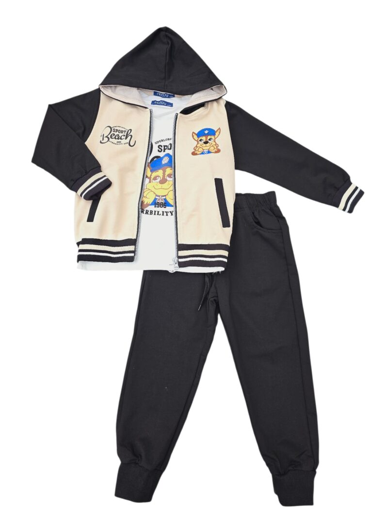 Trening modern pentru băieți, format din hanorac cu glugă și fermoar, tricou și pantaloni comozi. Materialul moale și plăcut la purtare oferă confort pe tot parcursul zilei, fiind ideal pentru joacă, plimbări sau activități zilnice. Designul vesel cu imprimeu animat îl face ușor de îndrăgit de cei mici. Material: 85% bumbac, 10% polyester, 5% elastan