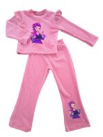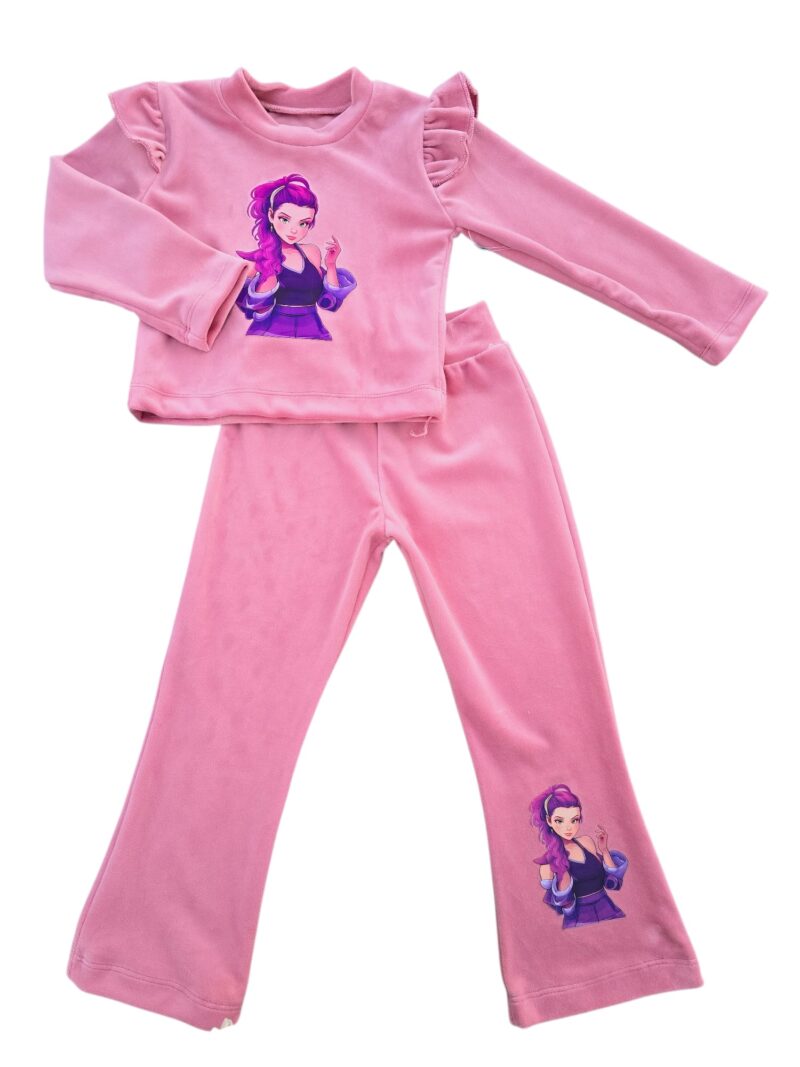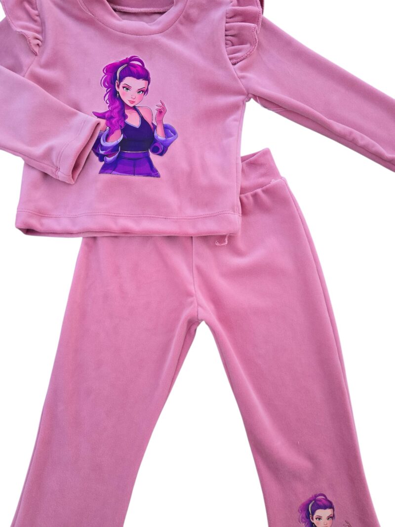 Trening fete din catifea, culoare roz, format din bluză cu mânecă lungă și volănașe la umeri, plus pantaloni comozi. Decorat cu personaj Huntrix – Rumi, cu imprimeu atractiv pe bluză și pe pantalon. Material moale și plăcut la atingere, ideal pentru ținute lejere și confort zilnic. Material: catifea- 100% bumbac Fabricat în Italia