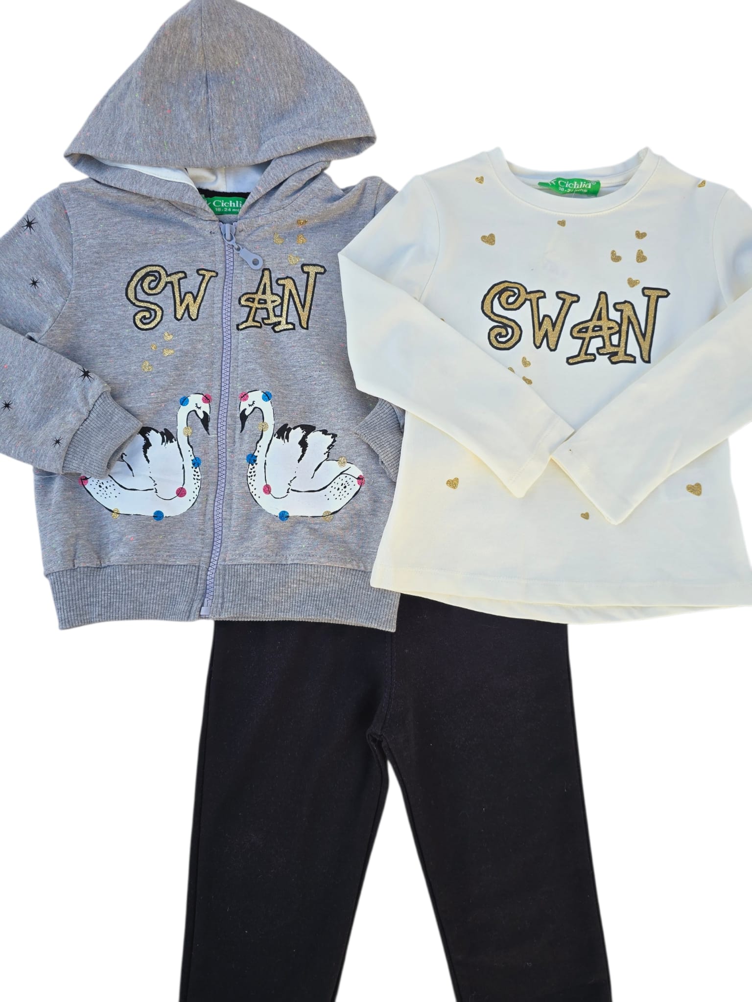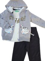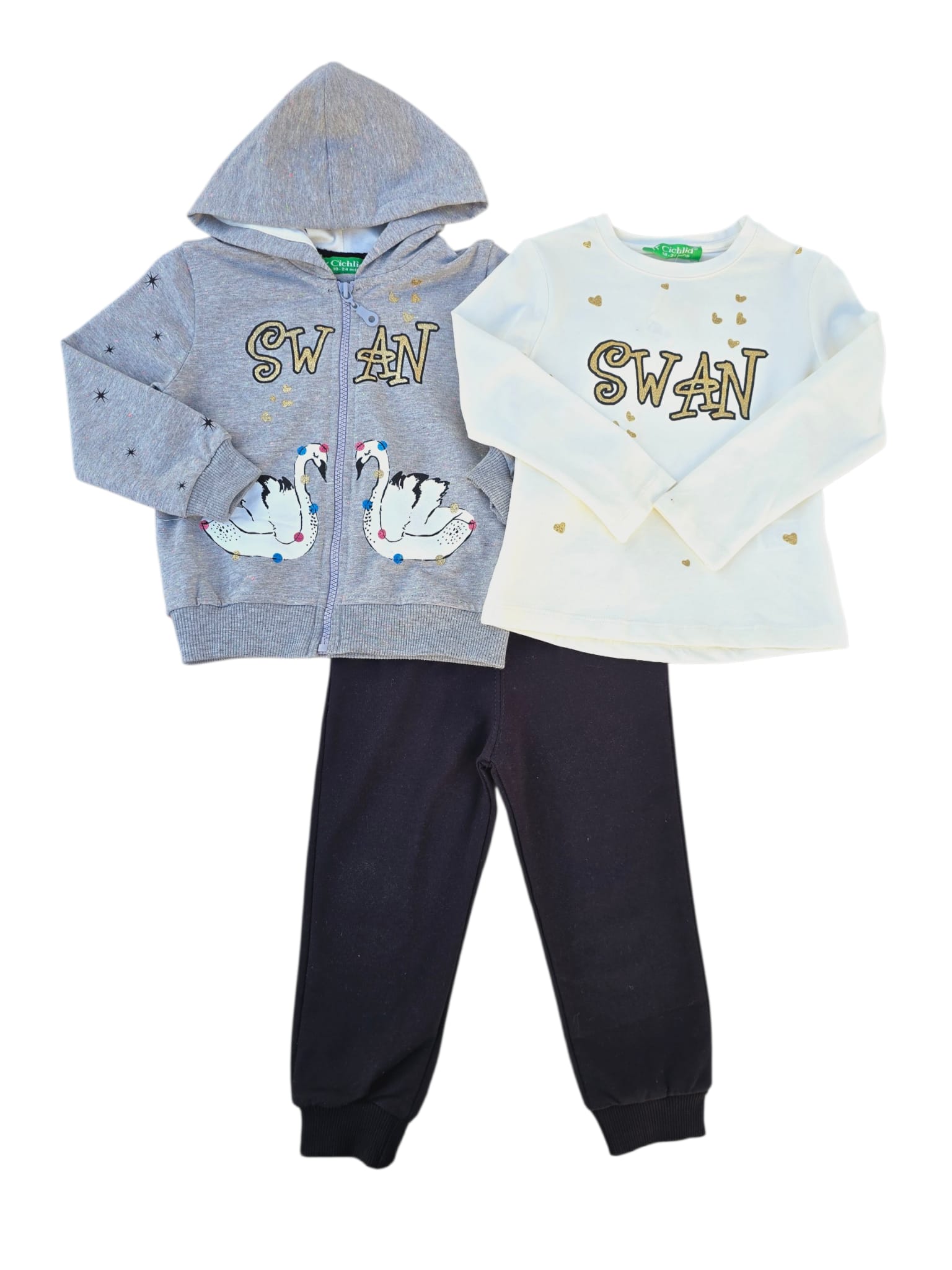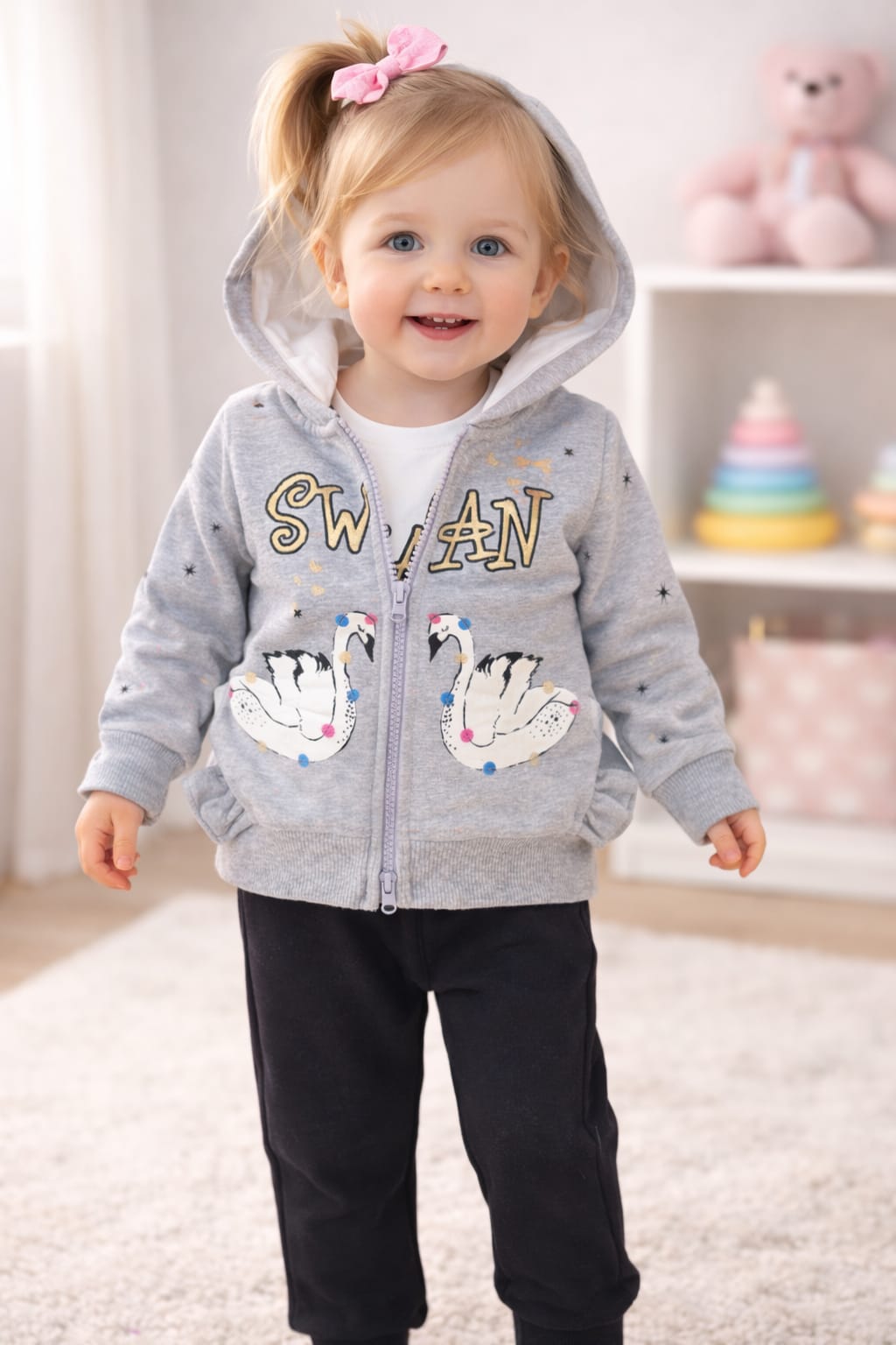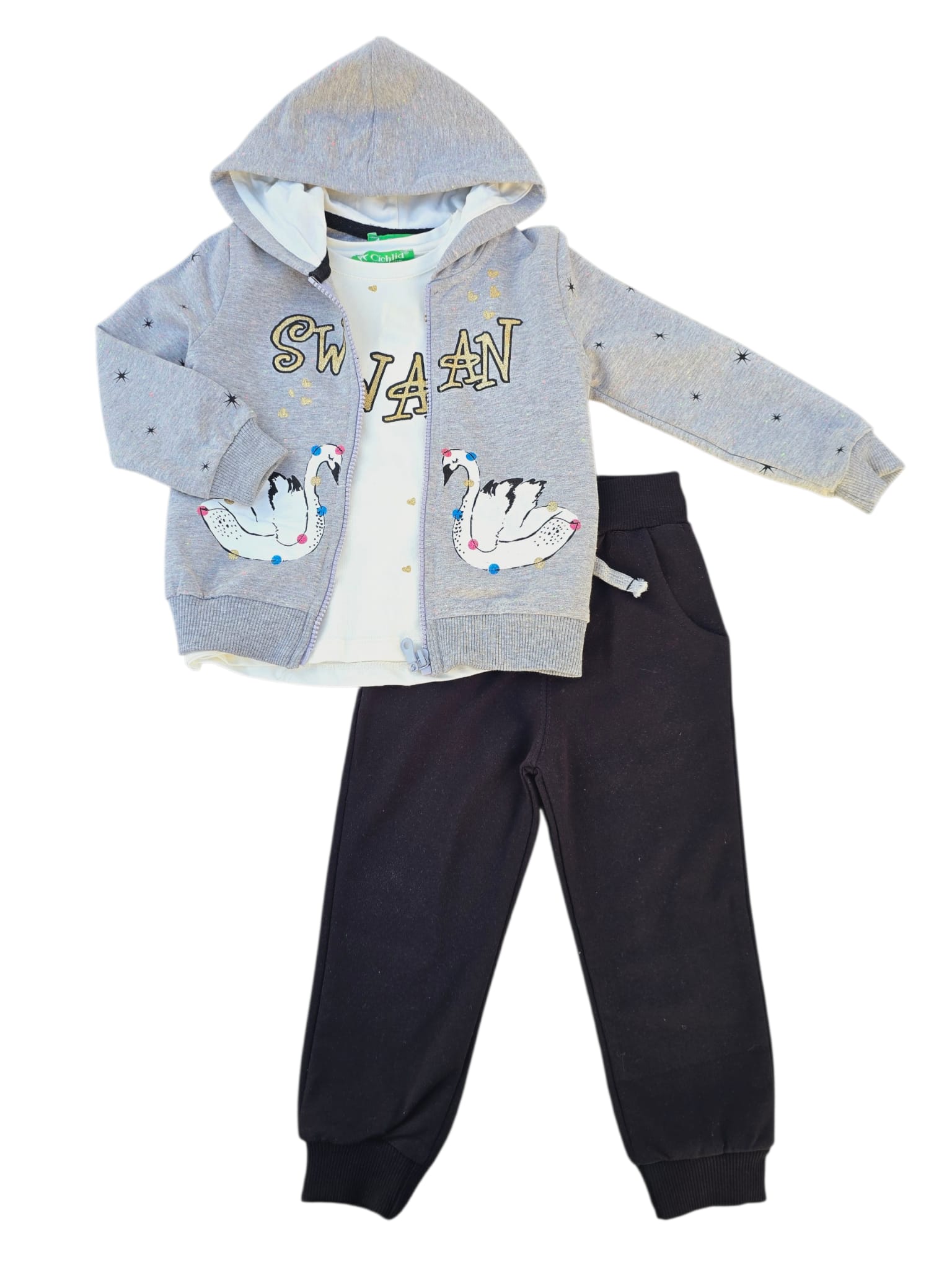 Trening pentru fetițe, compus din hanorac cu glugă, tricou și pantaloni comozi. Design modern cu imprimeu lebede și detalii delicate, realizat din material moale și confortabil, ideal pentru purtare zilnică. 🦢