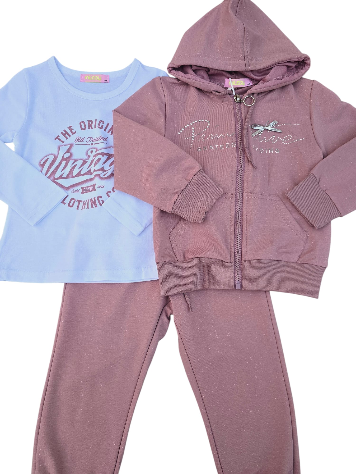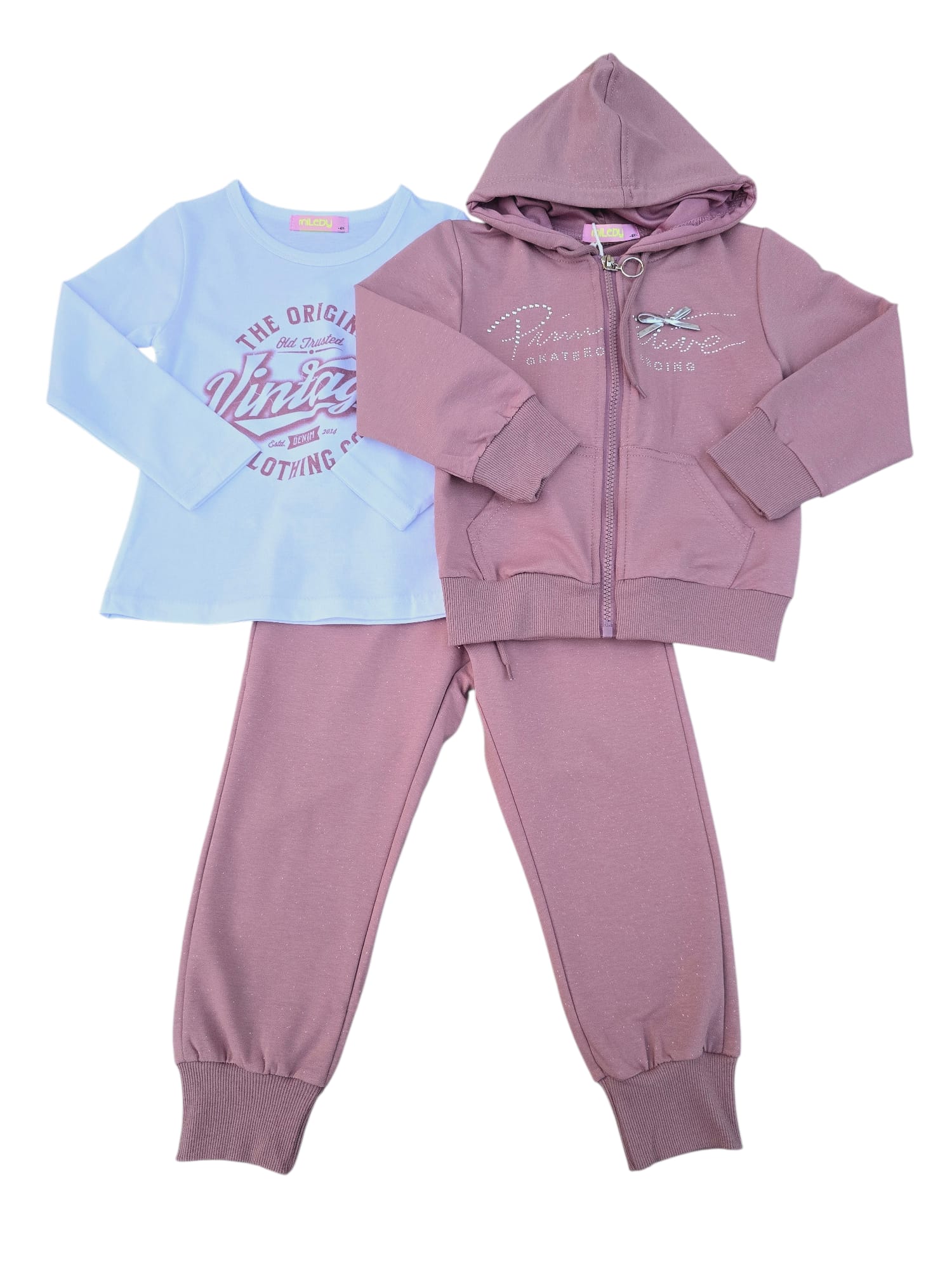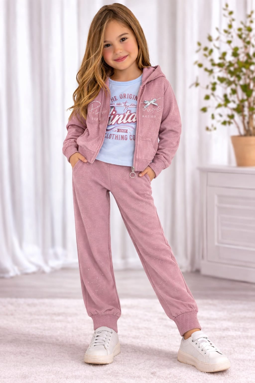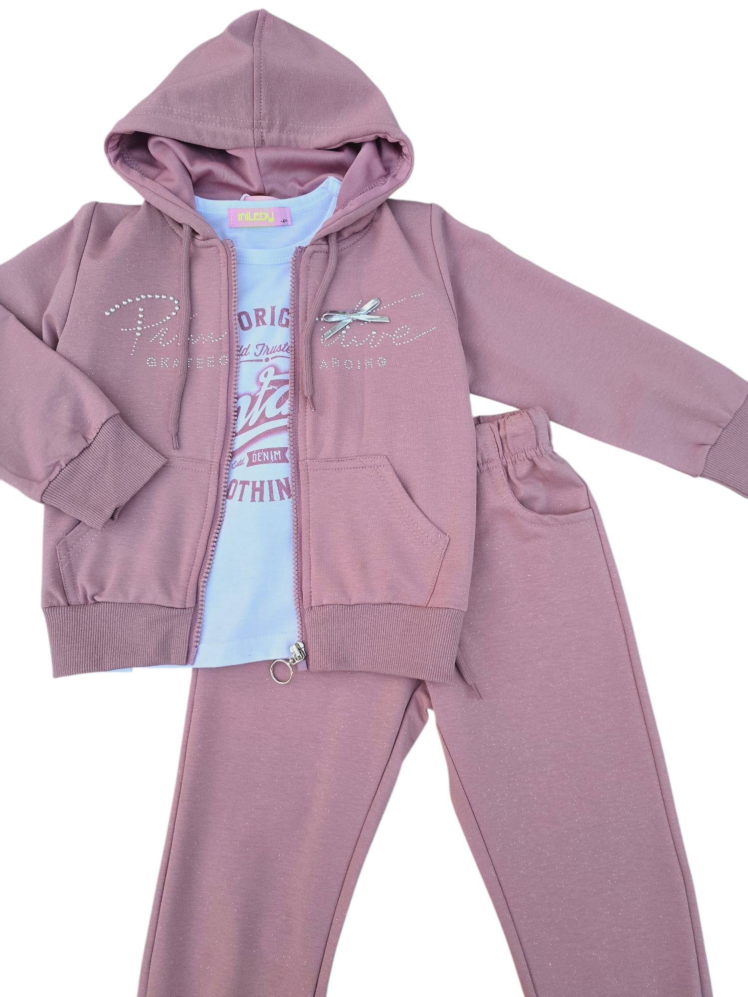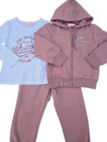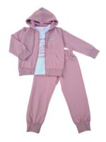 Set modern și confortabil, realizat din material moale cu sclipici discret integrat. Treningul este format din hanorac cu fermoar și glugă și pantaloni cu talie elastică și manșete, completat de o bluză în interior. Ideal pentru școală, plimbări sau activitățile zilnice.